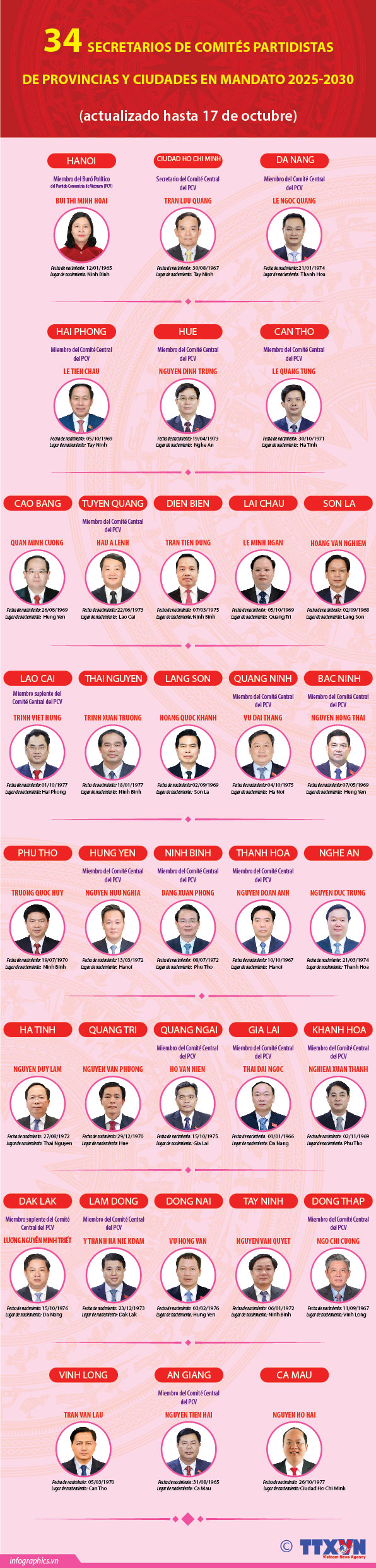 La Agencia vietnamita de Noticias (VNA) presenta respetuosamente la lista de 34 secretarios de los comités partidistas provinciales y municipales para el período 2025-2030.
