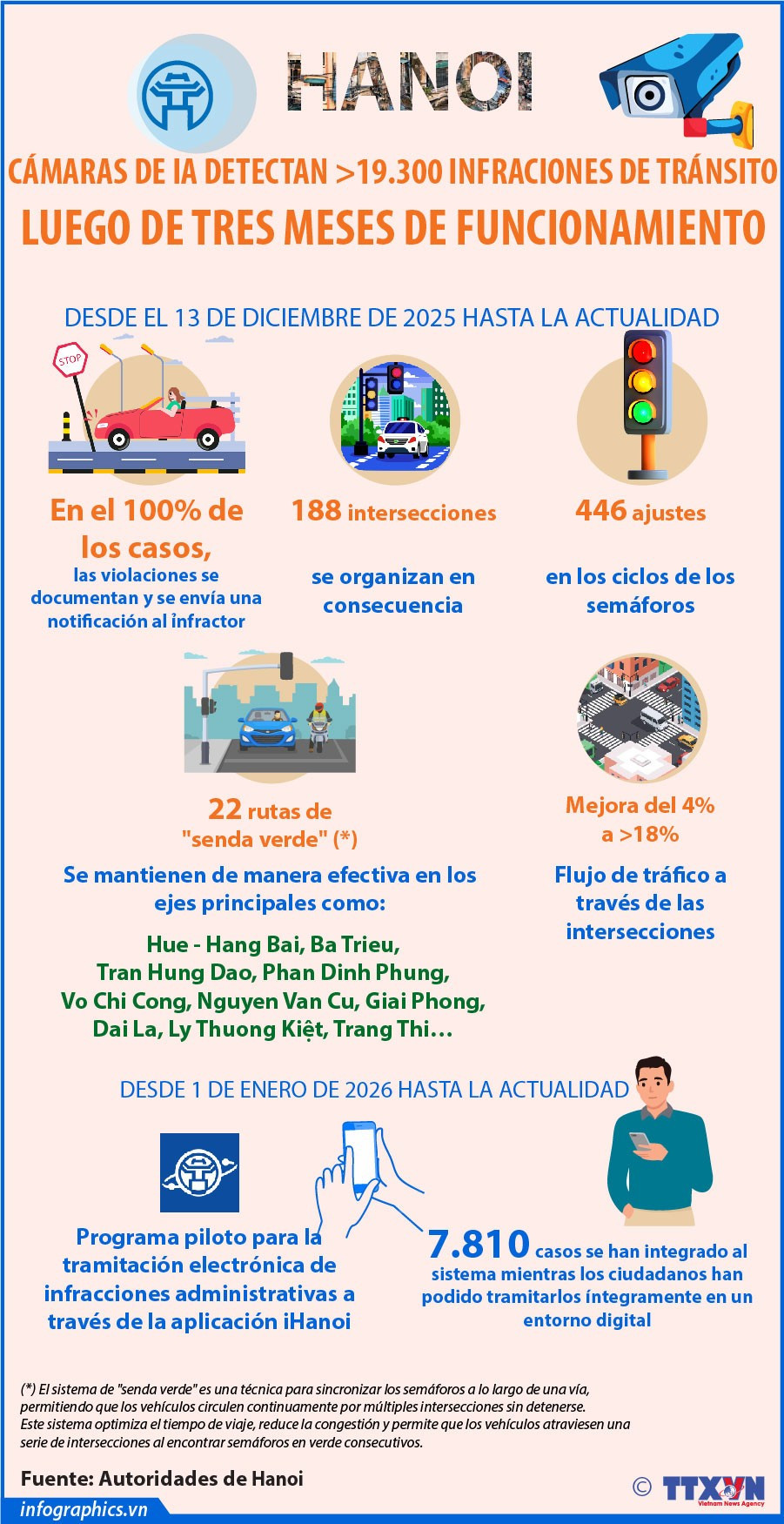 Según la Policía de la Ciudad de Hanoi, tras tres meses de funcionamiento, el sistema de casi 2.000 cámaras con IA en Hanói ha detectado y procesado más de 19.300 infracciones de seguridad vial, lo que ha contribuido a aliviar gradualmente la congestión del tráfico en la capital.