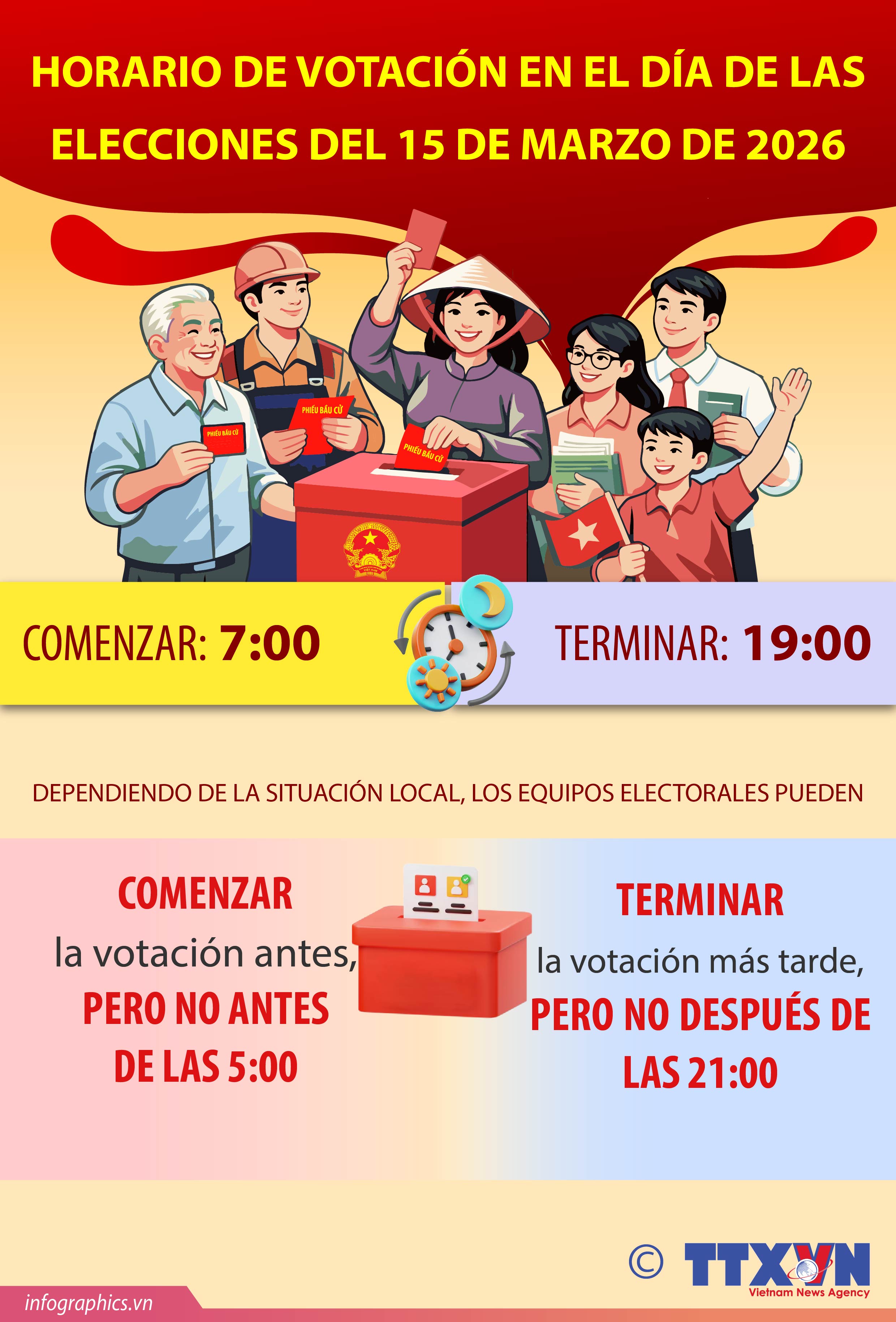 El 15 de marzo de 2026 tendrán lugar las elecciones a los diputados de la Asamblea Nacional de la XVI Legislatura y a los Consejos Populares para el período 2026-2031. De acuerdo con las regulaciones, el proceso de votación comenzará a las 7:00 y finalizará a las 19:00 del mismo día. Dependiendo de la situación local, los equipos electorales pueden decidir comenzar la votación antes, pero no antes de las 5:00, o terminarla más tarde, pero no después de las 21:00 de la misma jornada.