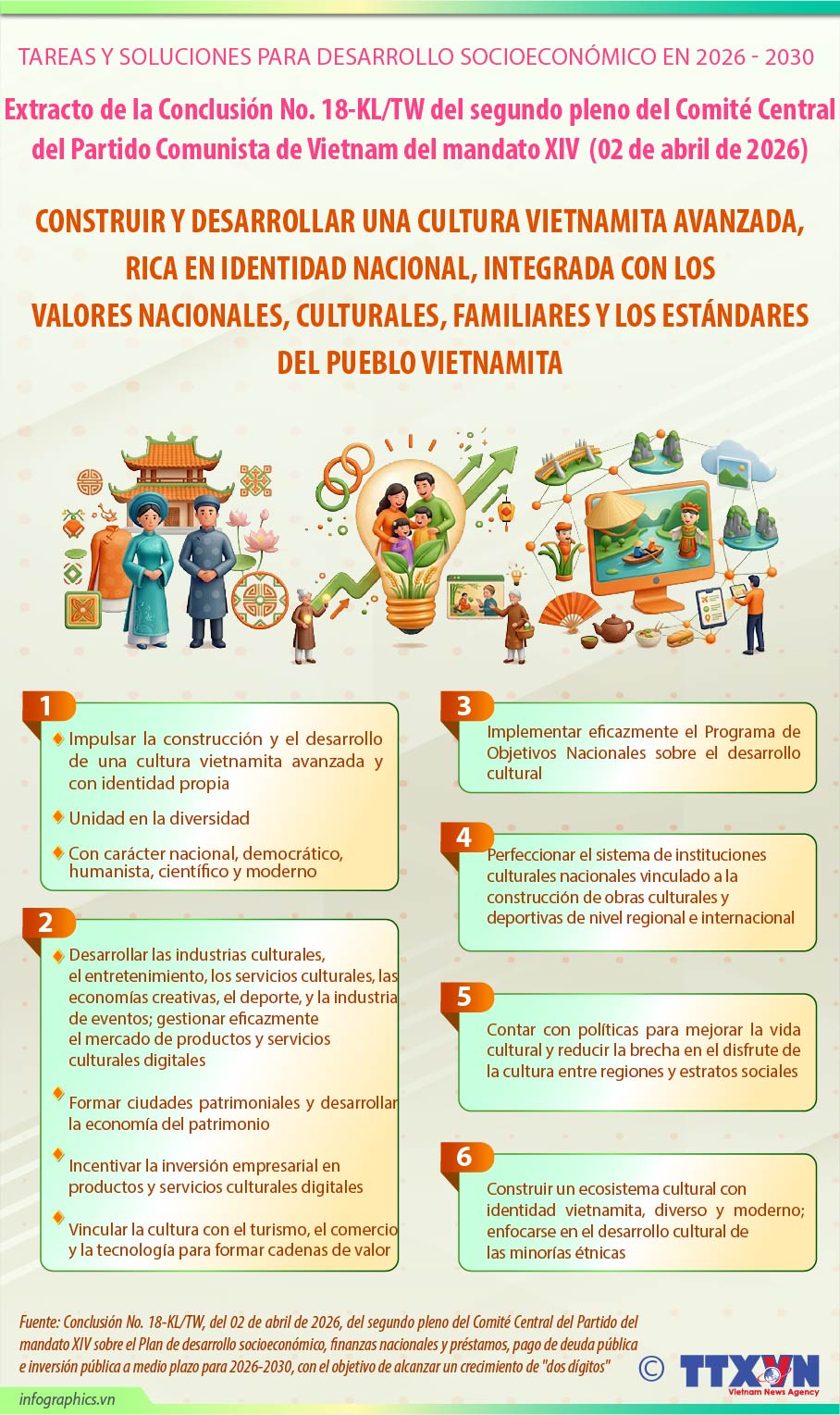 En nombre del Comité Central del Partido Comunista de Vietnam, el secretario general del Partido To Lam firmó la Conclusión n.º 18-KL/TW (2 de abril de 2026), que resume el segundo pleno del Comité Central del XIV mandato sobre el plan de desarrollo socioeconómico, las finanzas nacionales, la deuda pública y la inversión pública a mediano plazo para el período 2026–2030, orientado a alcanzar un objetivo de crecimiento de “dos dígitos”.