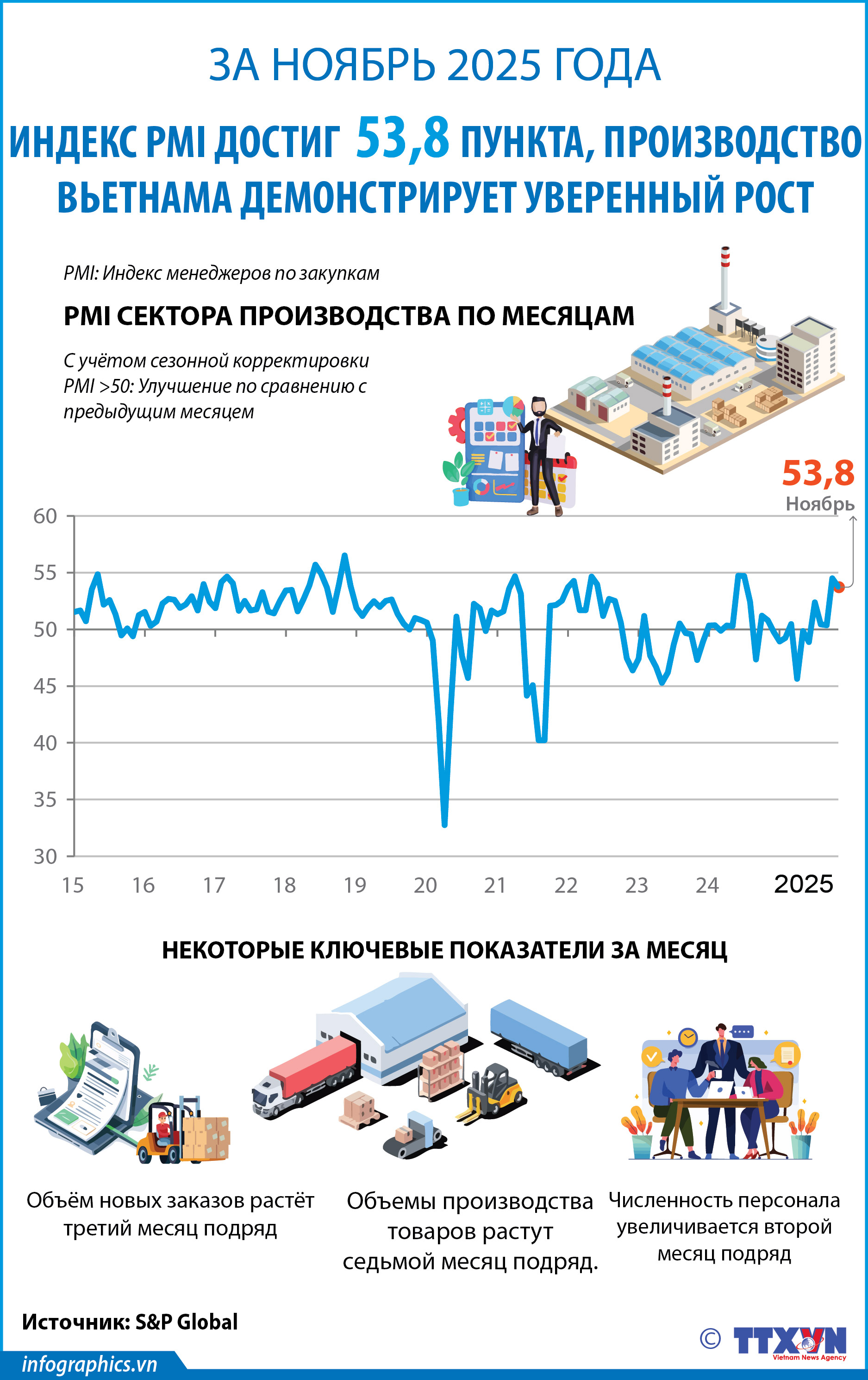 El Índice de Gestores de Compras (PMI) de Vietnam en noviembre de 2025 alcanzó los 53,8 puntos, por debajo de los 54,5 puntos de octubre de 2025, pero aún se mantuvo firmemente por encima del umbral de 50 puntos. Este resultado muestra que las condiciones comerciales siguen mejorando y que el sector manufacturero mantiene su impulso de recuperación por quinto mes consecutivo, a pesar de las interrupciones significativas en la cadena de suministro.