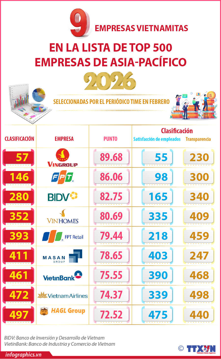 Nueve empresas vietnamitas están incluidas en la lista de las 500 mejores de Asia Pacífico, seleccionadas por el periódico The Time en febrero.