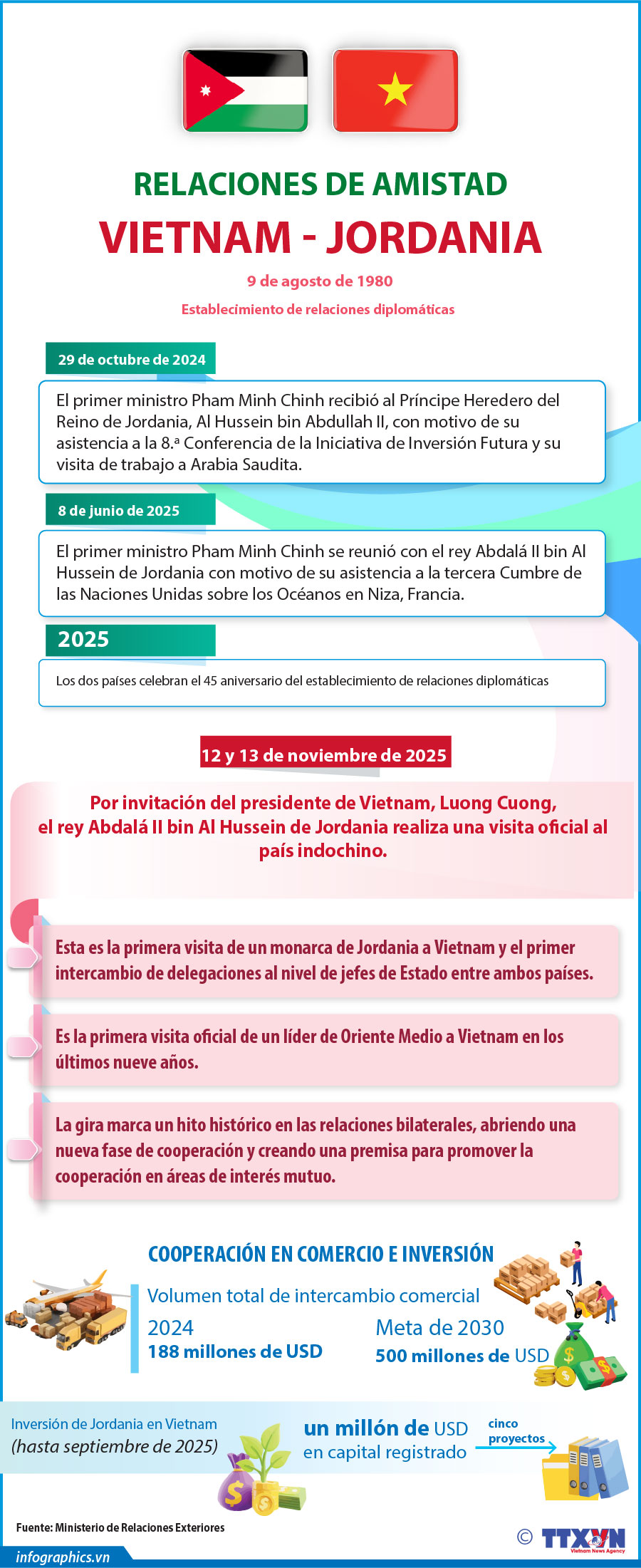El rey Abdullah II de Jordania efectúa una visita oficial a Vietnam los días 12 y 13 de noviembre, por invitación del presidente Luong Cuong.