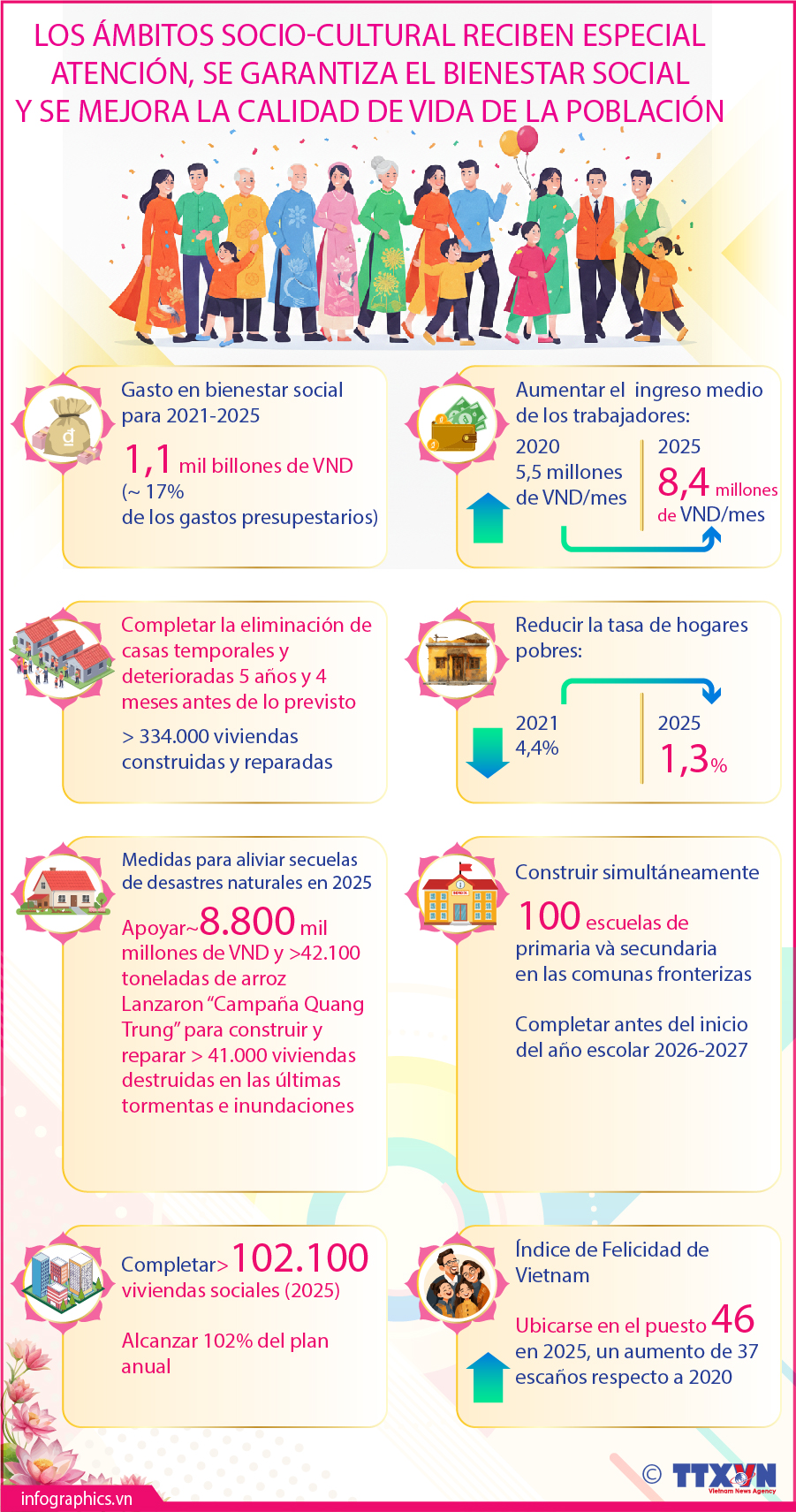 Durante el período 2021-2025, los ámbitos cultural y social recibieron la atención, se garantizó la seguridad social y se mejoró la vida de las personas. Según las Naciones Unidas, el índice de felicidad de Vietnam ocupó el puesto 46 en 2025, un aumento de 37 lugares con respecto a 2020.