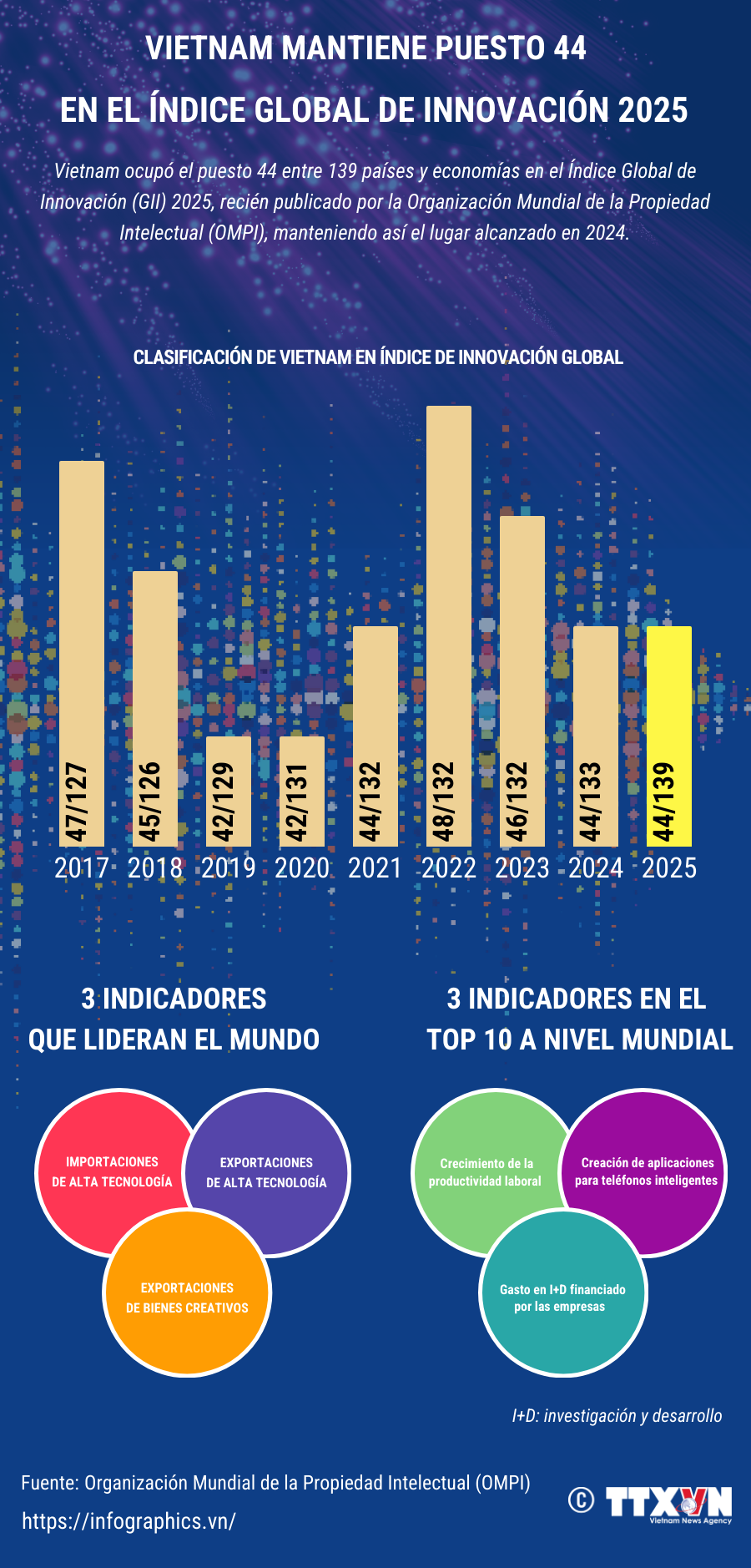 Vietnam ocupó el puesto 44 entre 139 países y economías en el Índice Global de Innovación (GII) 2025, recién publicado por la Organización Mundial de la Propiedad Intelectual (OMPI), manteniendo así el lugar alcanzado en 2024.