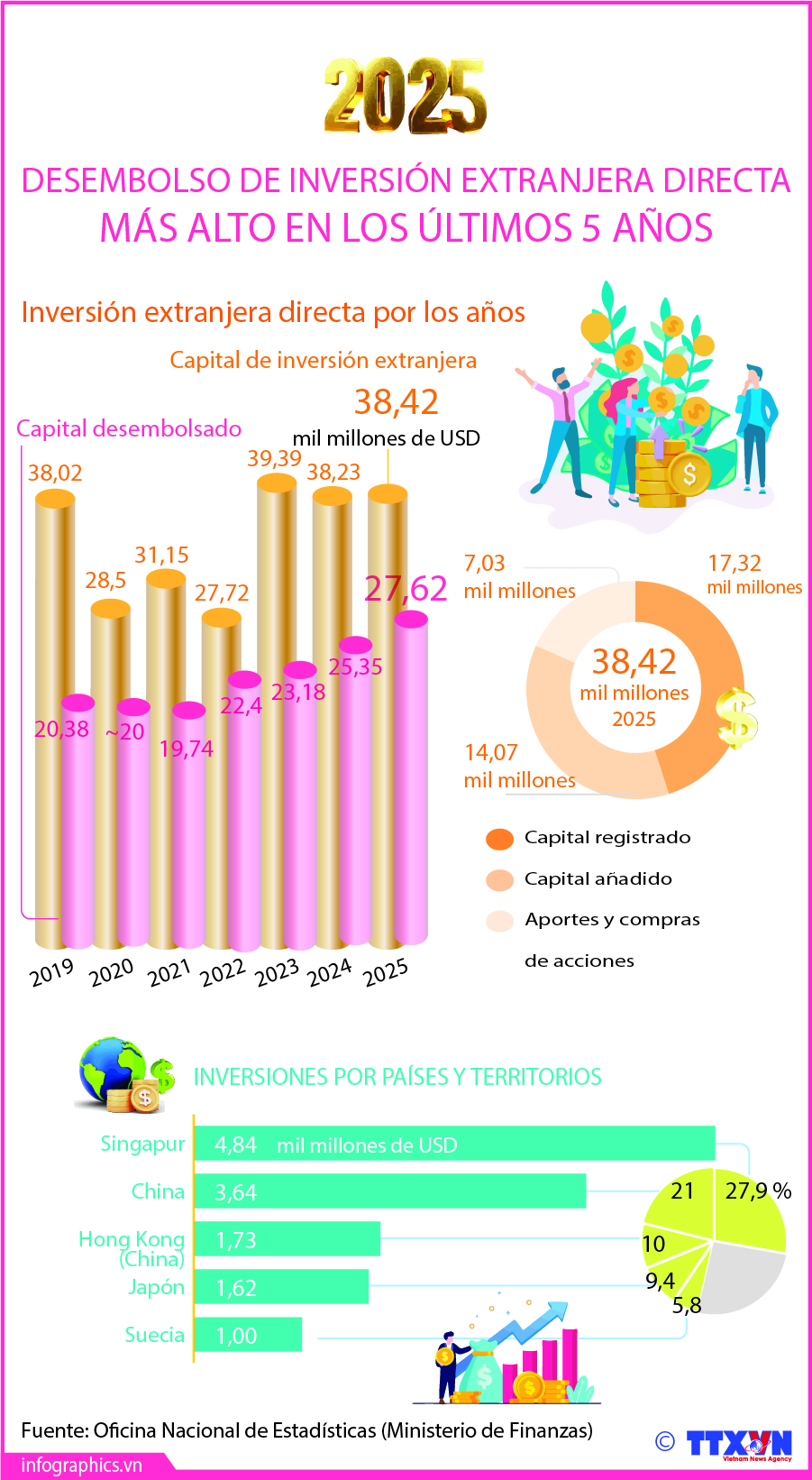 Hasta el 31 de diciembre de 2025, Vietnam atrajo 38,42 mil millones de dólares bajo el concepto de inversión extranjera directa (IED), lo que representa un aumento interanual del 0,5%. El desembolso de IED se sitúa en 27,62 mil millones de dólares, un incremento del 9% con respecto a 2024, la cifra más alta de los últimos 5 años.